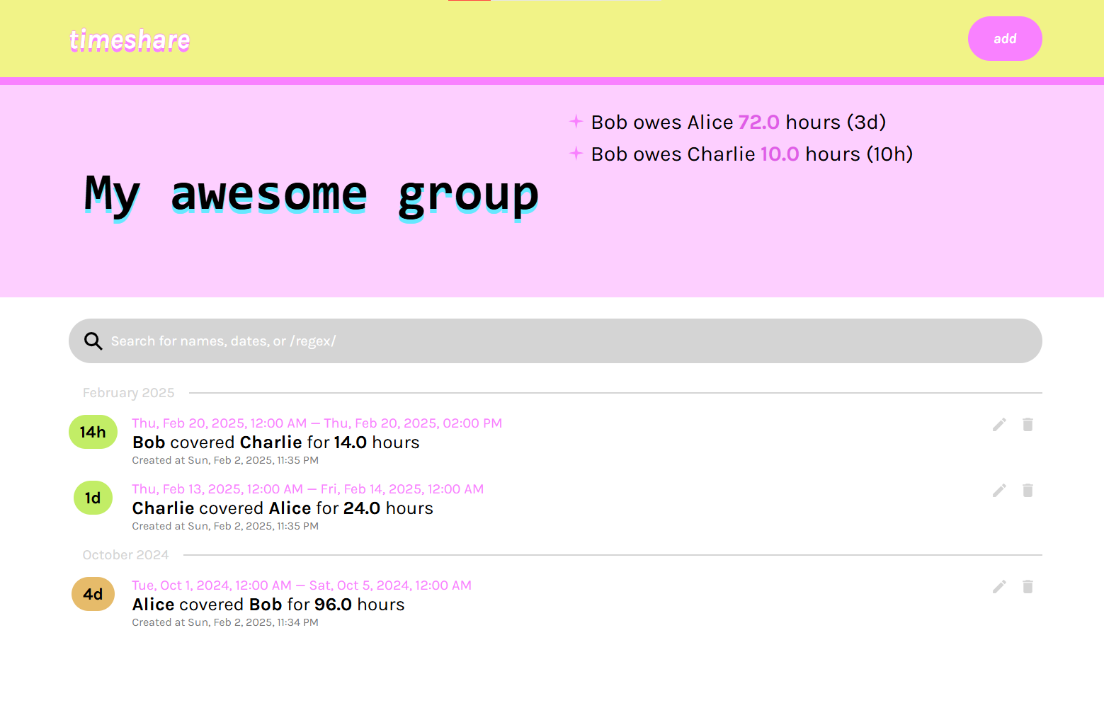Timeshare is a tiny web app that aims to be like Splitwise for on-call hours. There's nothing super fancy here: it's a web app built with SvelteKit and PostgreSQL. Mostly, I wanted to see what all of the hype was about with SvelteKit, and build something cool and practical for my colleagues in the process.